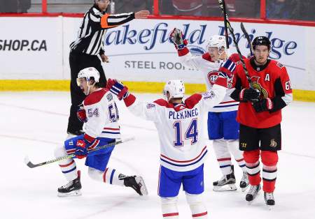 Charles Hudon celebrates a goal with Tomas Plekanec and right wing Brendan Gallagher as Ottawa Senators right wing Mark Stone looks on during first period NHL hockey action in Ottawa on Monday Oct. 30, 2017. Sean Kilpatrick / The Canadian Press