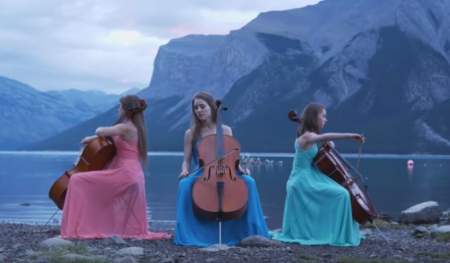 The video begins with the three cellists sitting on chairs at Lake Minnewanka in Banff National Park. It’s no coincidence that the mountain range in the background is known as the Three Sisters.