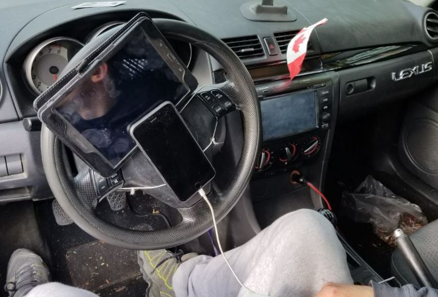 As one of the officers approached the vehicle, he saw the driver had attached his phone to his steering wheel with a piece of string, and wedged his tablet between the wheel and the phone. The headphones were plugged into the phone.