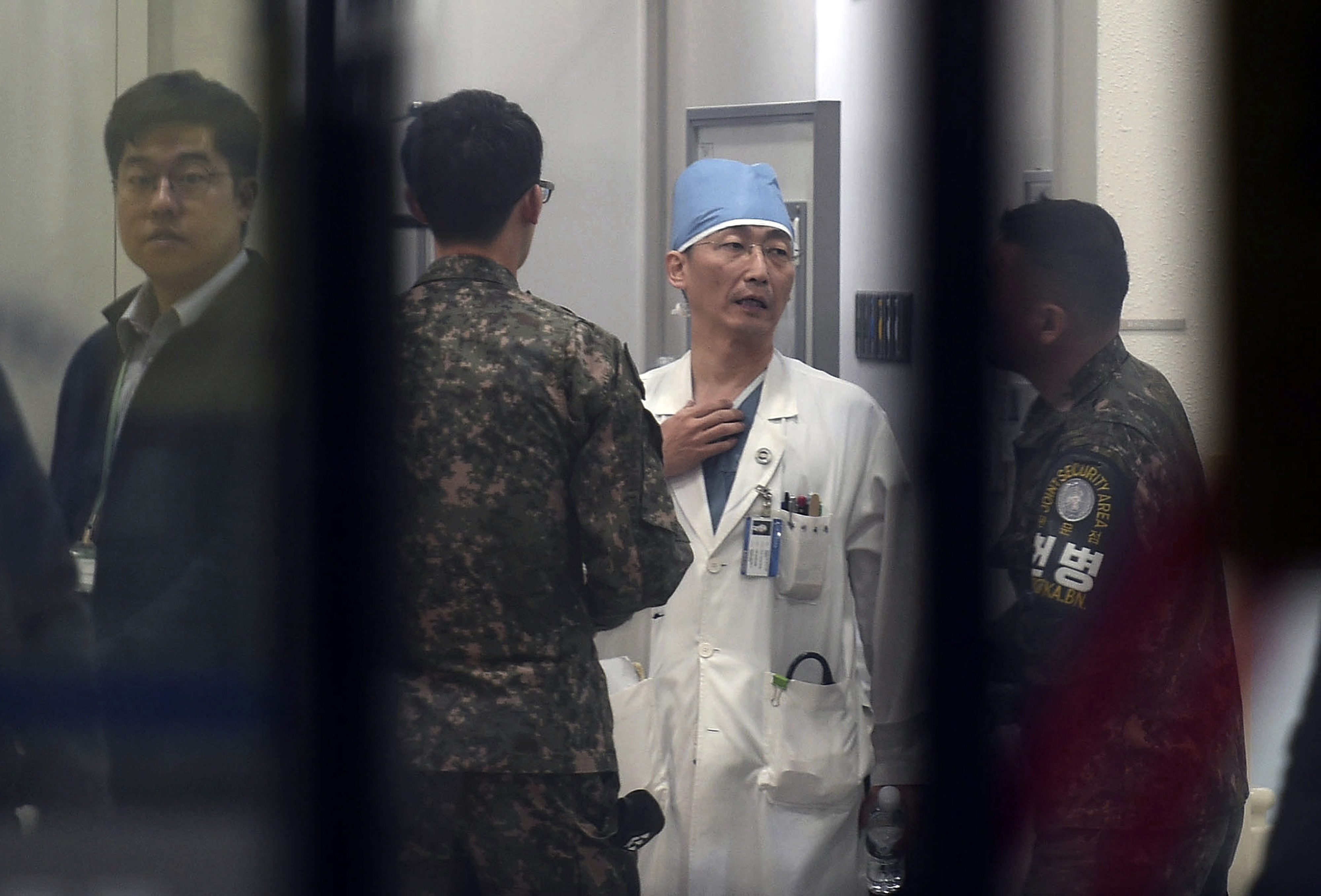 The soldier dashed across the border at the Panmunjom truce village on Monday, as former comrades from the North opened fire on him, hitting him at least four times.