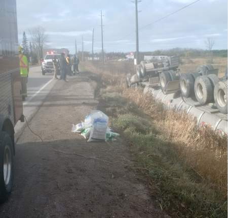 Police say the gravel shoulder gave out and the truck rolled, coming to rest upside down in a ditch.