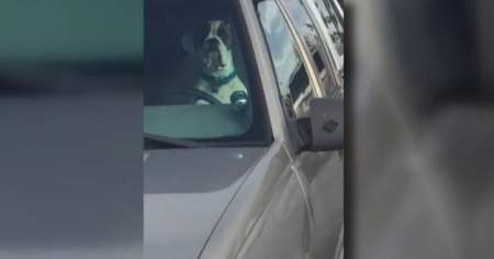 Sitting in the driver’s seat with the windows partially open, the dog doesn’t seem to be distressed, just annoyed.
