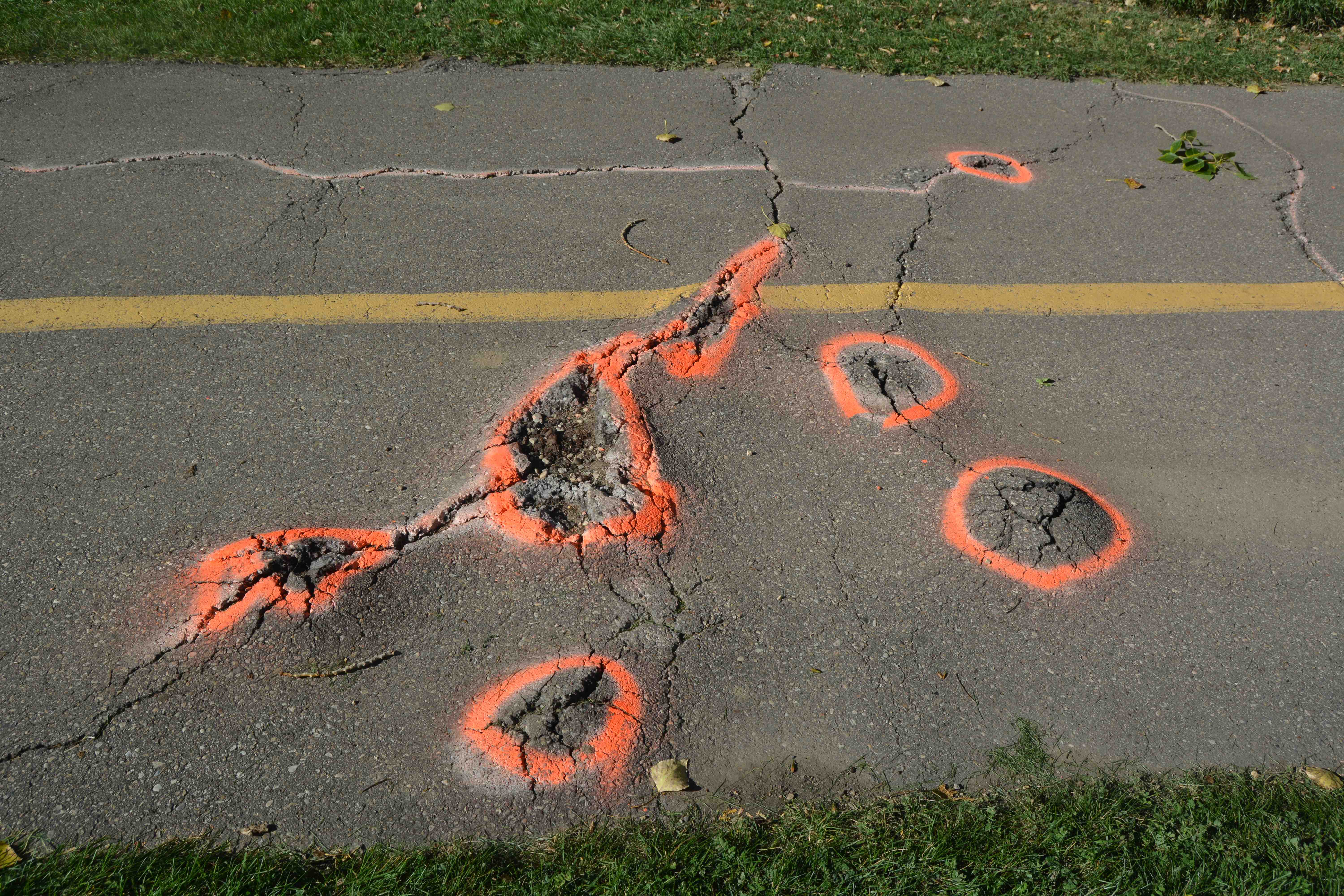 Richmond showed councillors problems with the asphalt trail system where tree roots emerge. He said the city’s solution is to mark them with orange spray paint.
