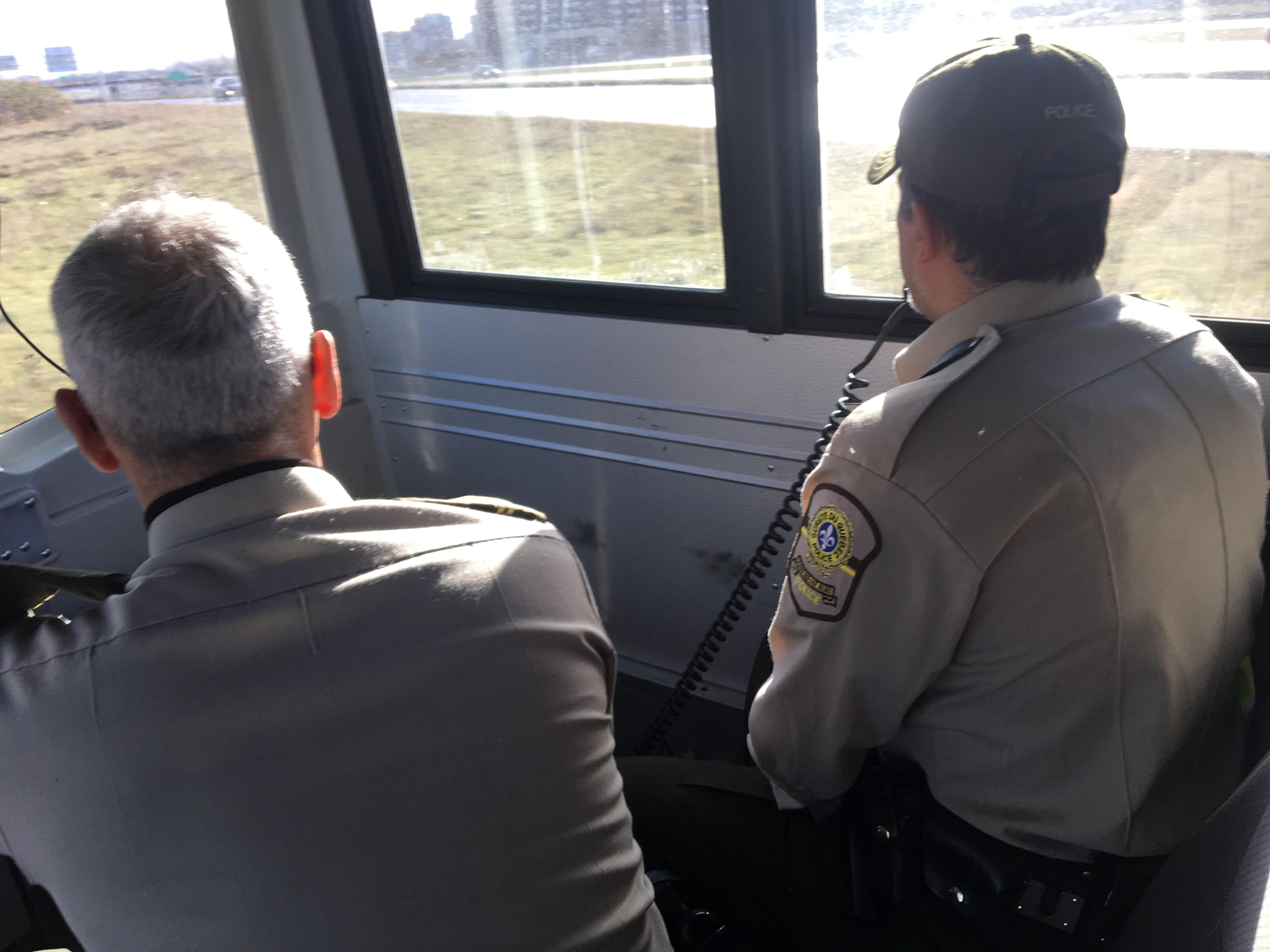 Agents from the SAAQ and the SQ rode the bus up and down Highway 15 in Laval, getting a perfect vantage point to look into vehicles from above and catch people texting and driving. The officers were also on the lookout for people not wearing their seatbelts.