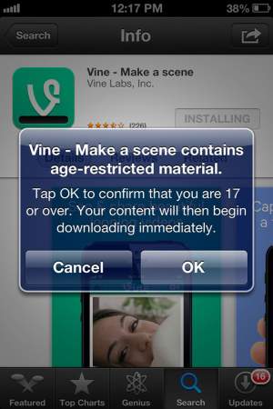 The age rating was changed as part of Vine’s latest app update, V 1.0.5. Users now have to confirm that they are over 17 years of age before downloading the application.