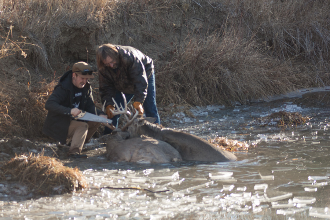 The living buck was struggling to stay alive and out of the icy water.