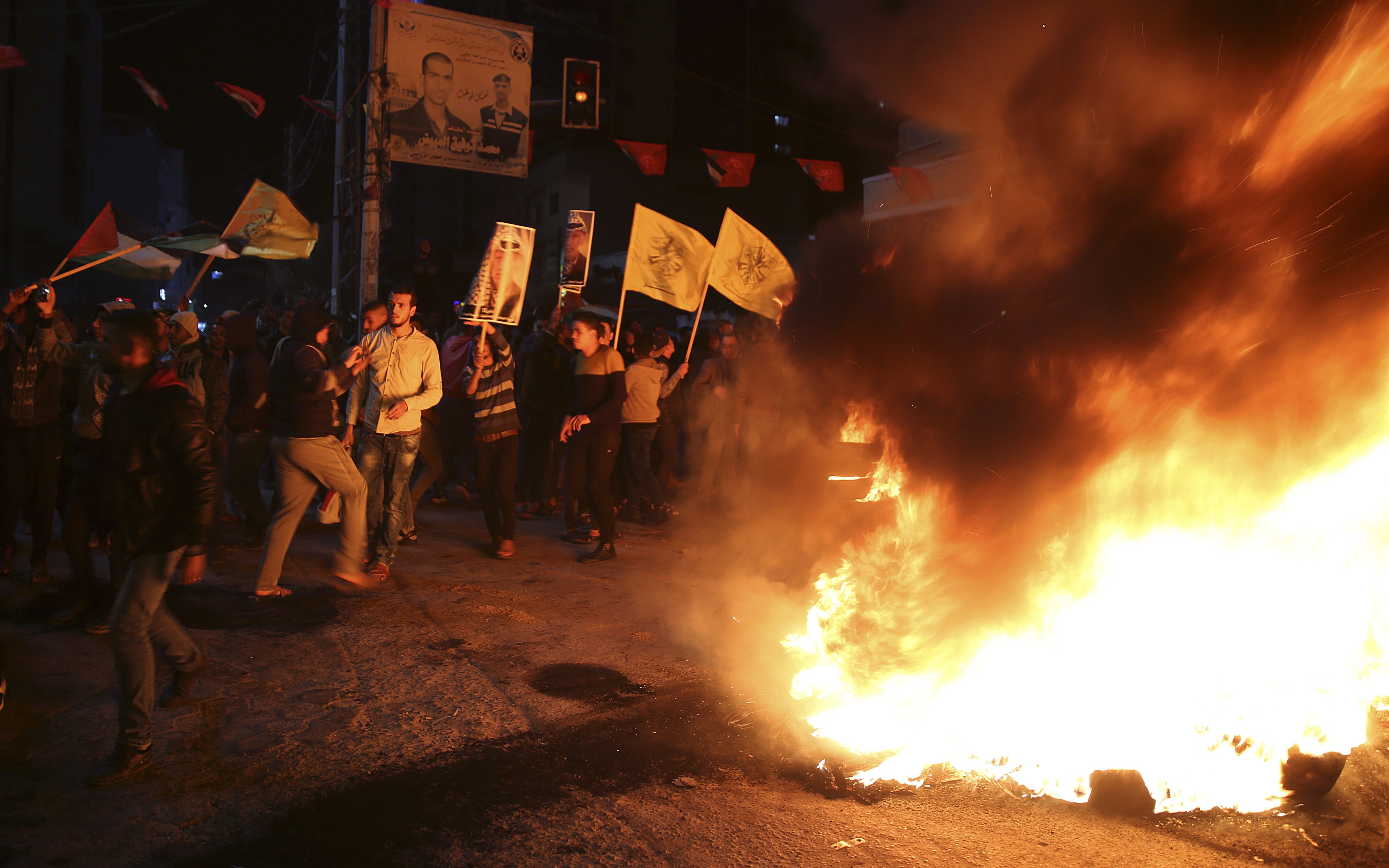Spontaneous protests sparked in Gaza overnight, with angry youths burning tires, American and Israeli flags and Trump posters.