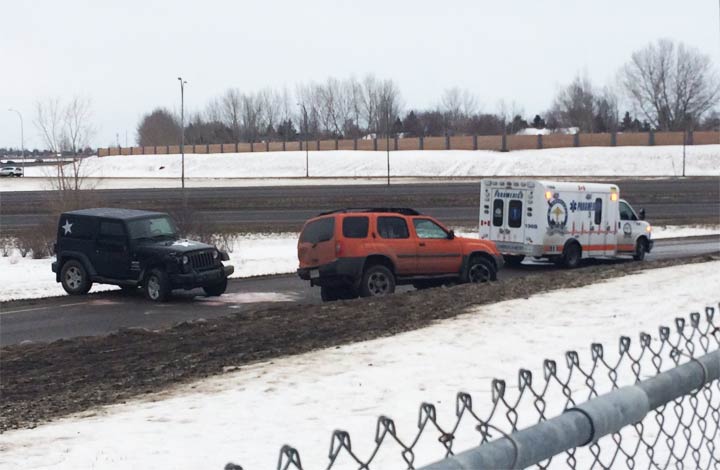 The two-vehicle collision happened on the southbound off-ramp from Attridge Drive to Circle Drive East on Sunday at around 10:55 a.m. CT.