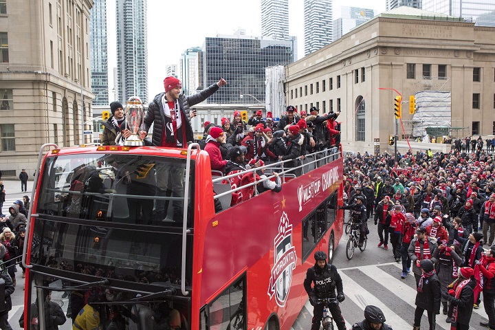 Toronto FC players basked in the chants of “TFC” and sprayed more champagne towards people on the sidewalk along the way.
