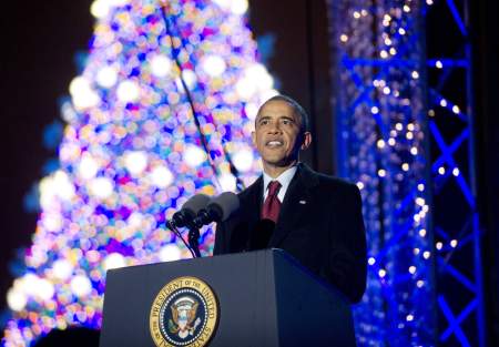 US. President Barack Obama speaks during the National Christmas Tree lighting ceremony in Washington, DC, December 6, 2013. ). GETTY IMAGES