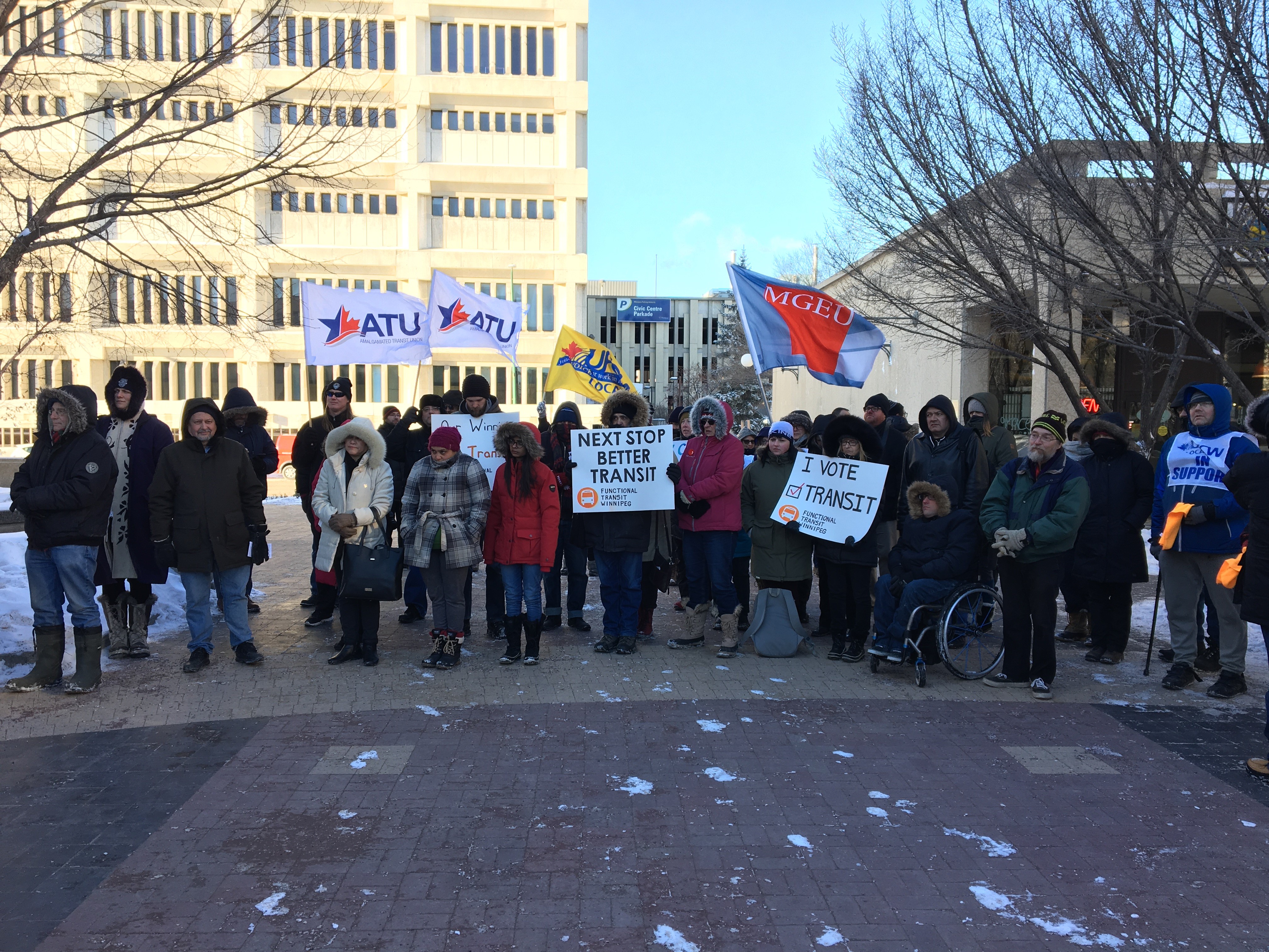Beach was just one of dozens outside of City Hall Monday, many holding signs and chanting. The MGEU, ATU and Functional Transit Winnipeg were all present.