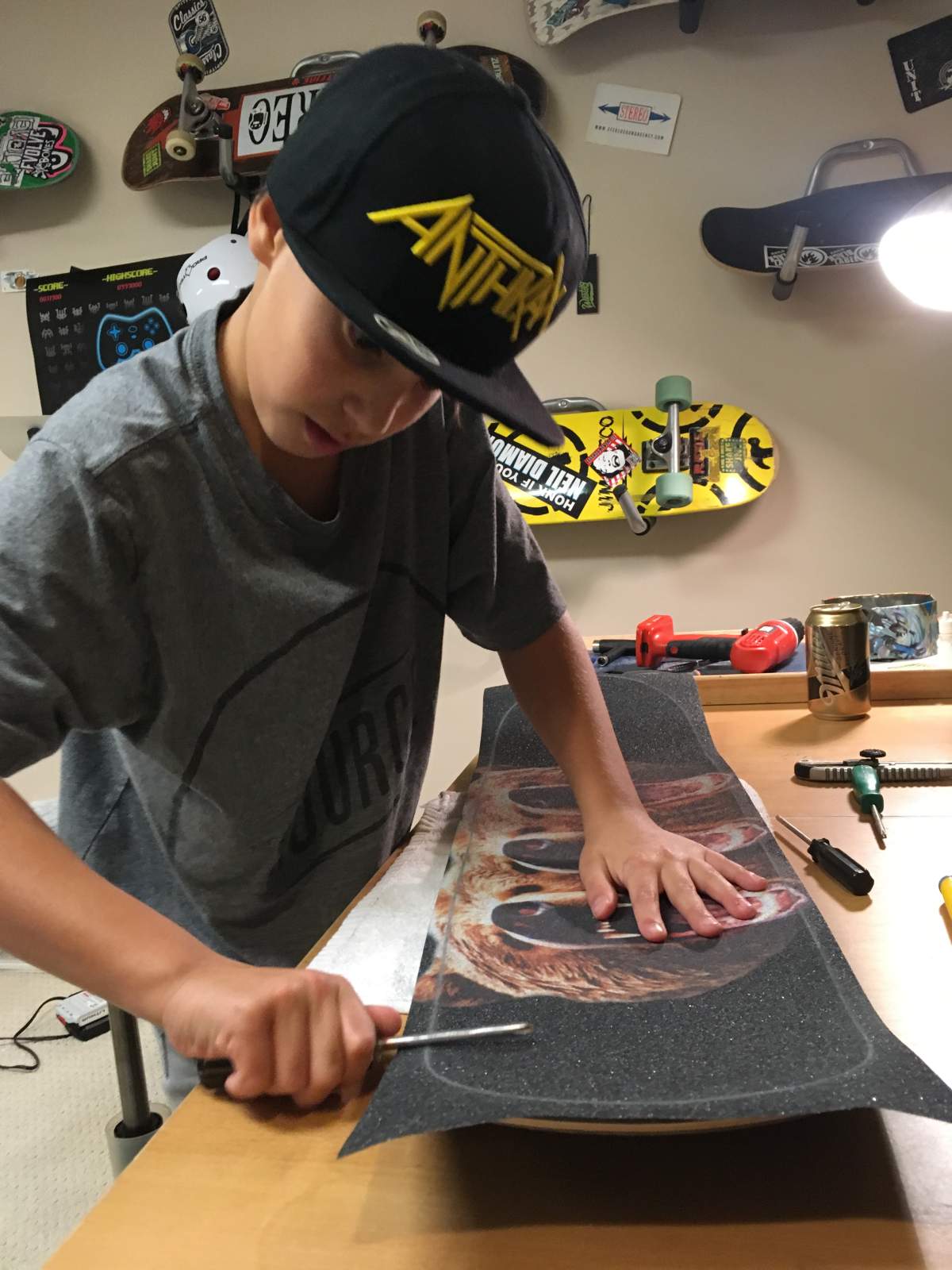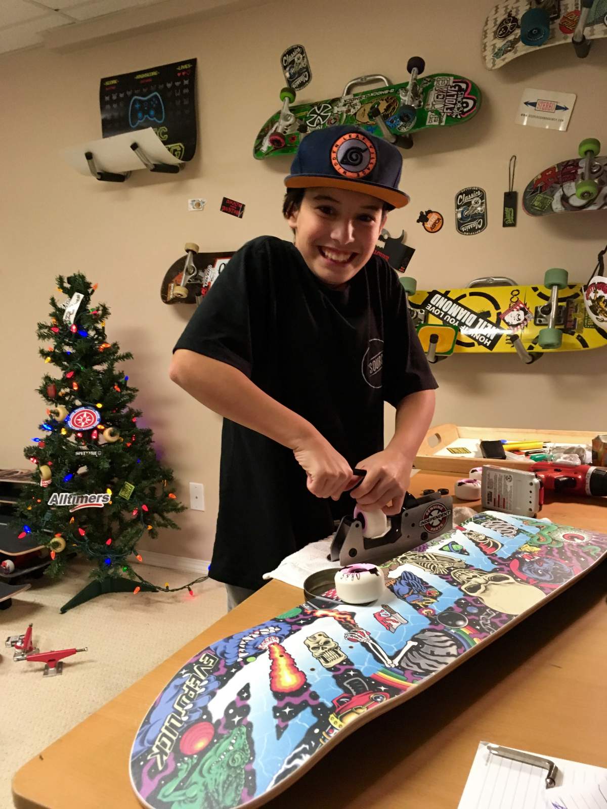 This year, Ethan was the recipient of a grant from GoFundMe’s Kid Heroes campaign. Building skateboards can be an expensive way to give back – each board costs up to $180 – and Ethan was the winner of a $1,000 grant, which allowed the duo to make 16 boards this year – a new record for them.