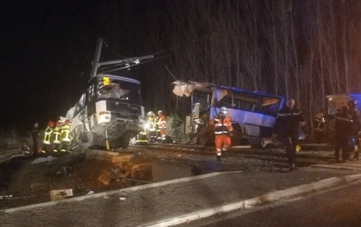 Four teenagers were killed and seven seriously injured after a train and a school bus collided outside the town of Perpignan in southwestern France on Thursday, the interior ministry said.