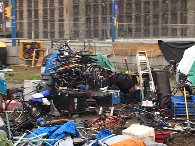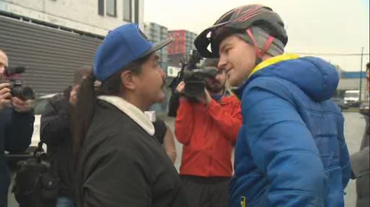 A press conference addressing the eviction of residents of the Sugar Mountain Tent City on Franklin Street in Vancouver was interrupted by a cyclist who asked about bike theft on Friday.