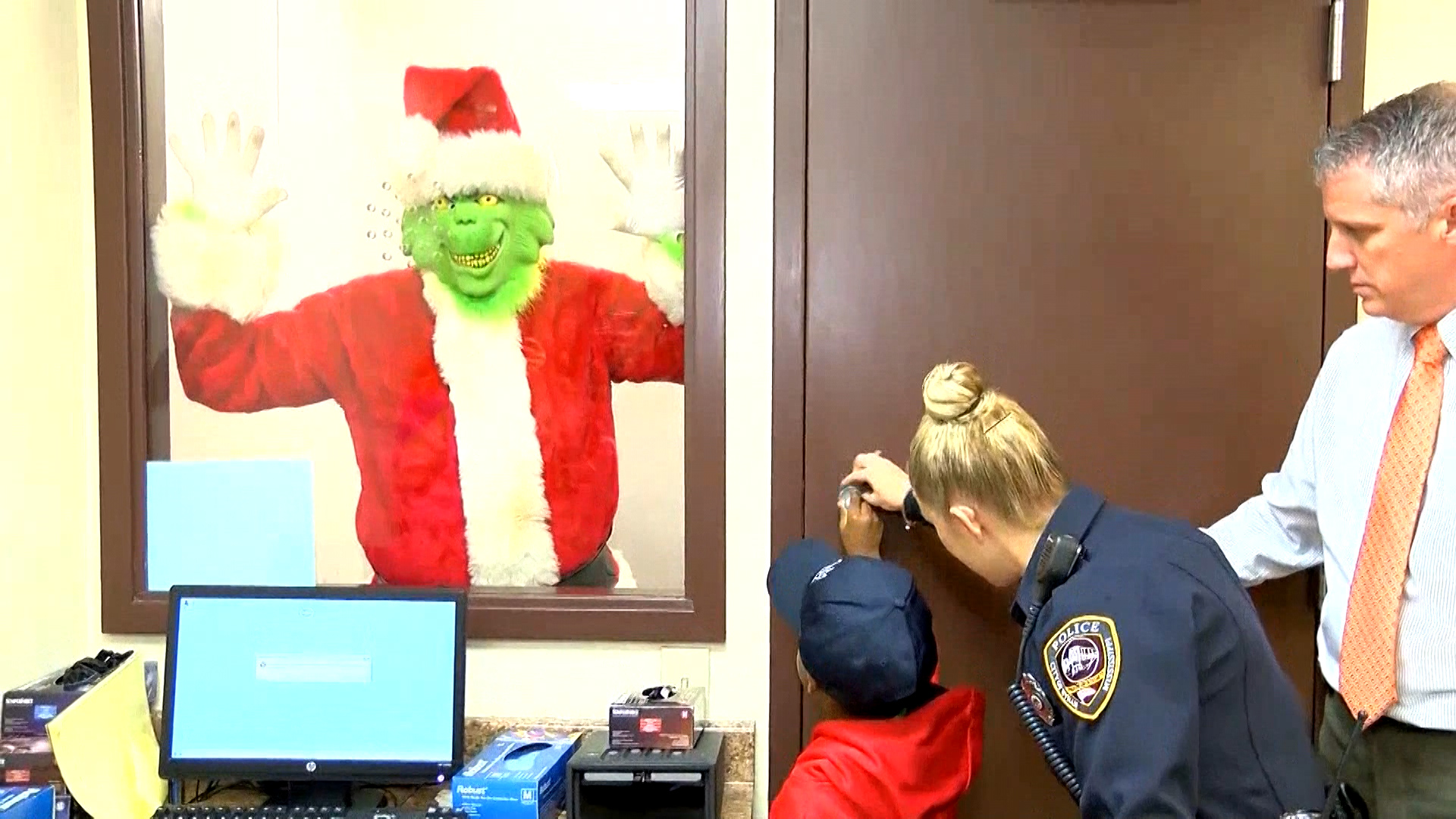 With help from police, TyLon then takes the man dressed up as the Grinch and places him in a holding room, locking the door behind him.