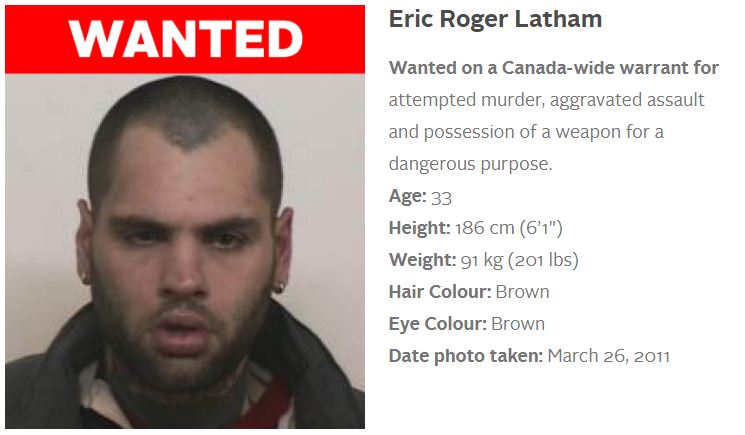 Latham is wanted on a Canada-wide warrant for attempted murder, aggravated assault and possession of a weapon for a dangerous purpose.