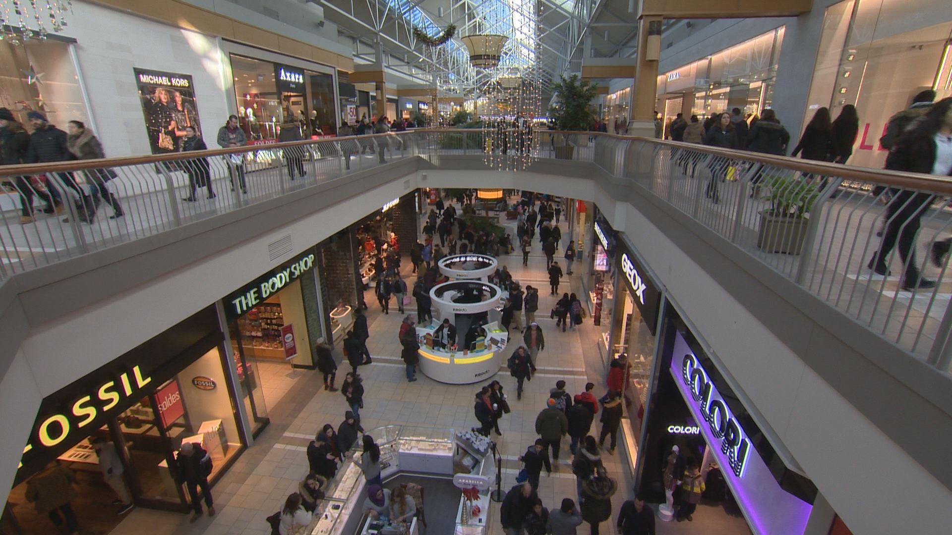 At Fairview Mall in Pointe-Claire, people lined the halls waiting for stores to open at 1 p.m. Outside, parking spots were few and far between.