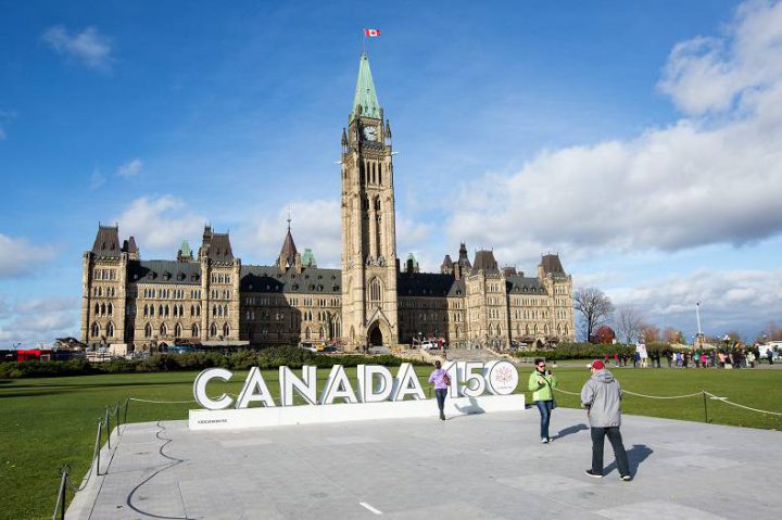 Tourists take their picture at the Canada 150 sign on Parliament Hill in Ottawa, Ontario on Monday, Oct. 30, 2017. THE CANADIAN PRESS/Lars Hagberg