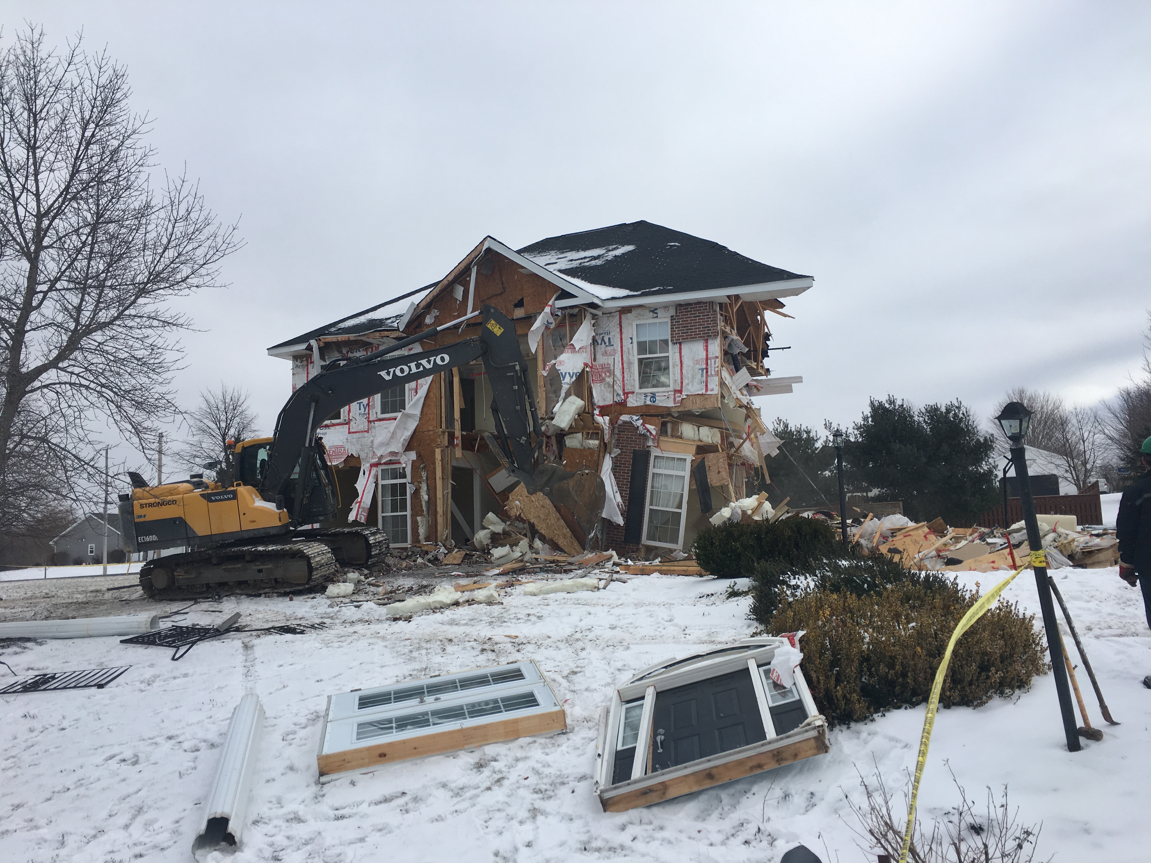 “We knew it would have to be taken down due to the structural damage to the house. So this was the day that it was decided they would take it down. And uh, there it goes,” Strickey said on Tuesday, as she stood on her property and an excavator ripped into the home behind her.