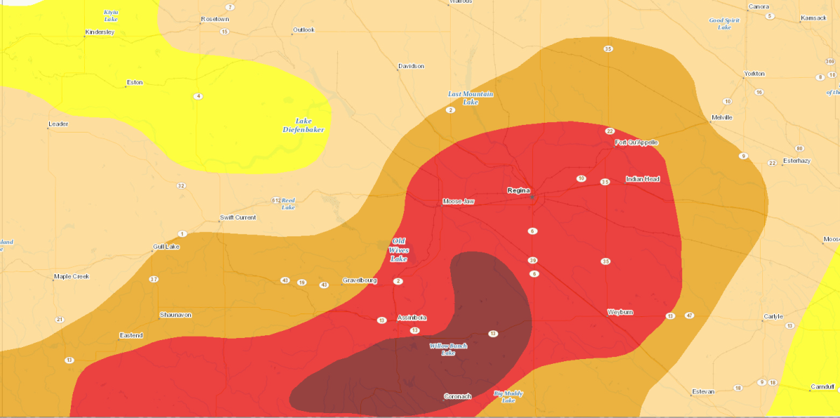 According to the Canadian Drought Monitor, a small region in south central Saskatchewan, including Regina, Eastend and Weyburn are in an extreme drought. There are exceptional drought conditions in the Coronach, Horse Creek and Assiniboia areas.