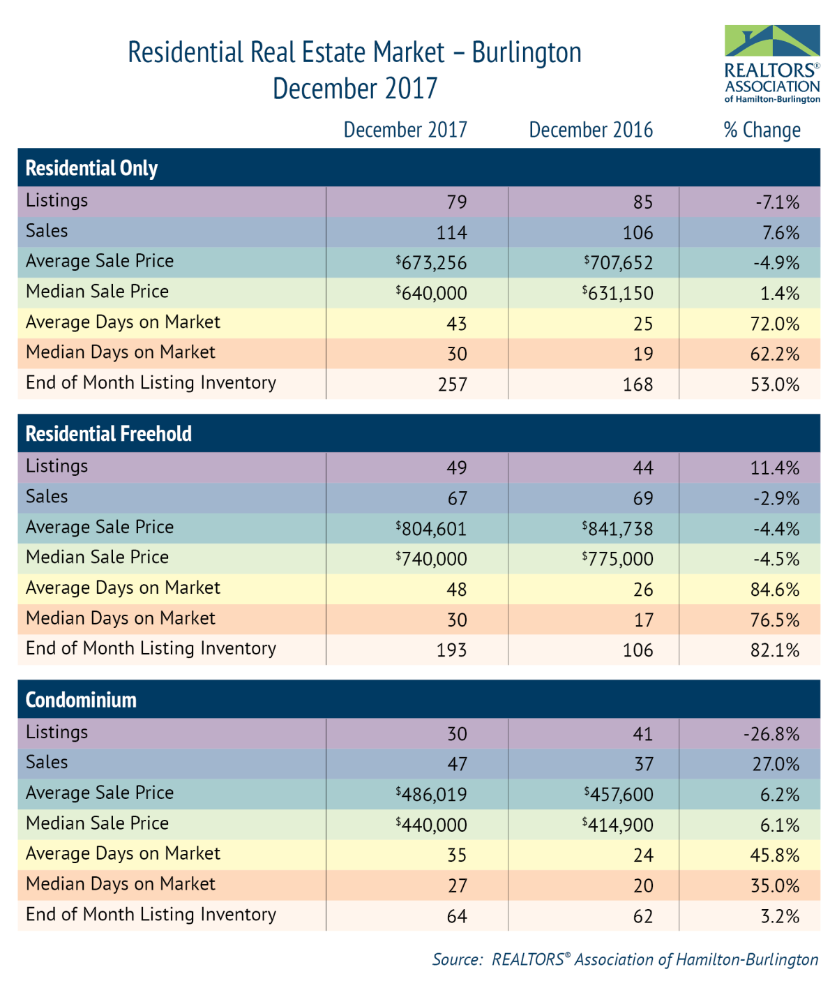 The Realtors’ Association of Hamilton-Burlington says residential listings increased by another 4.5 per cent last month, while sales dipped seven per cent in December to 444.