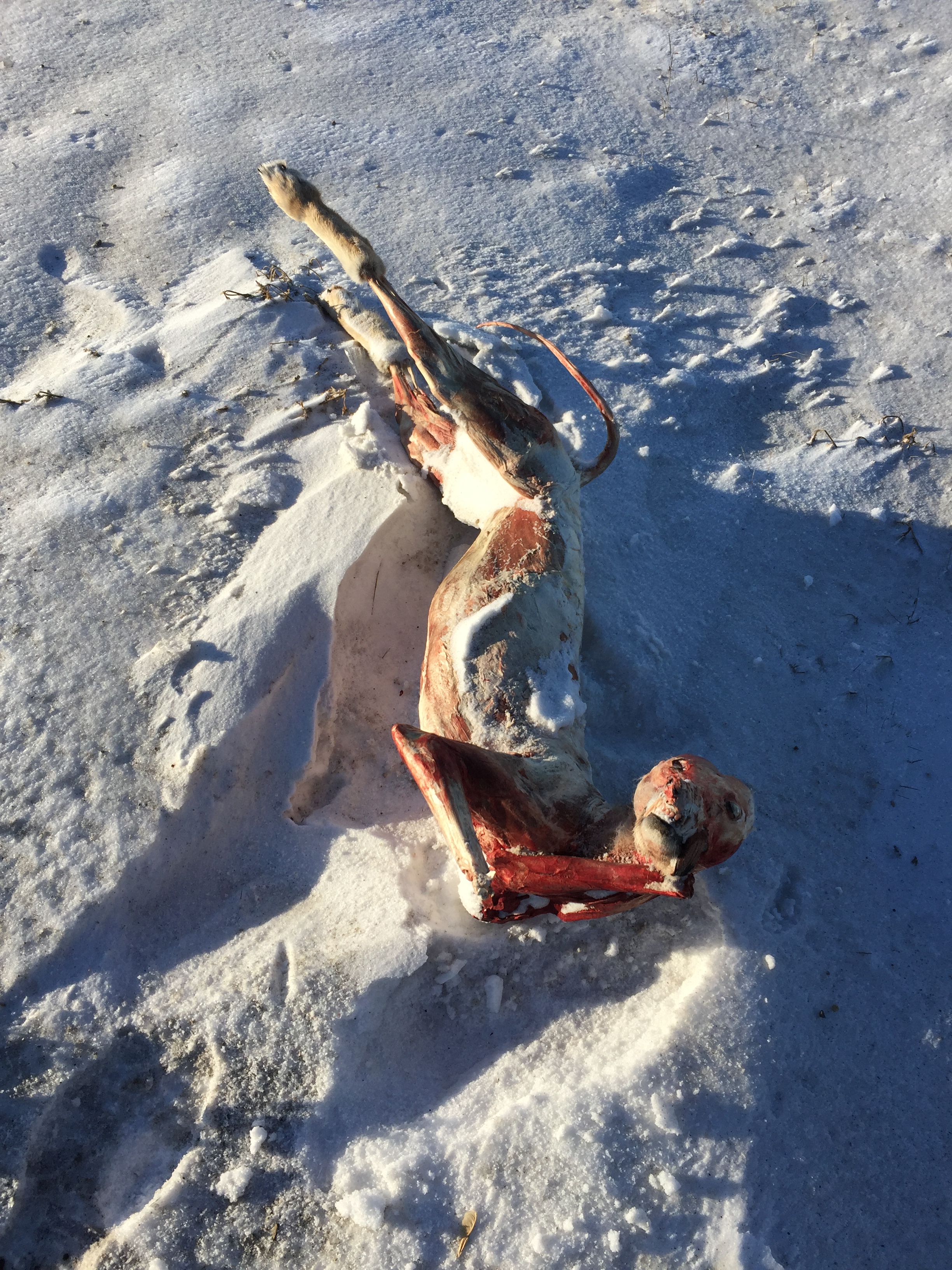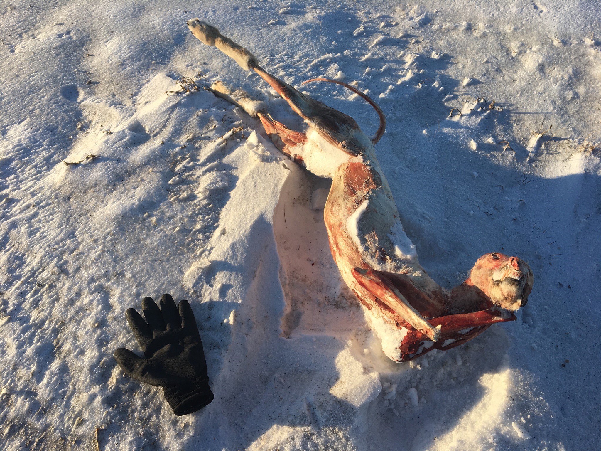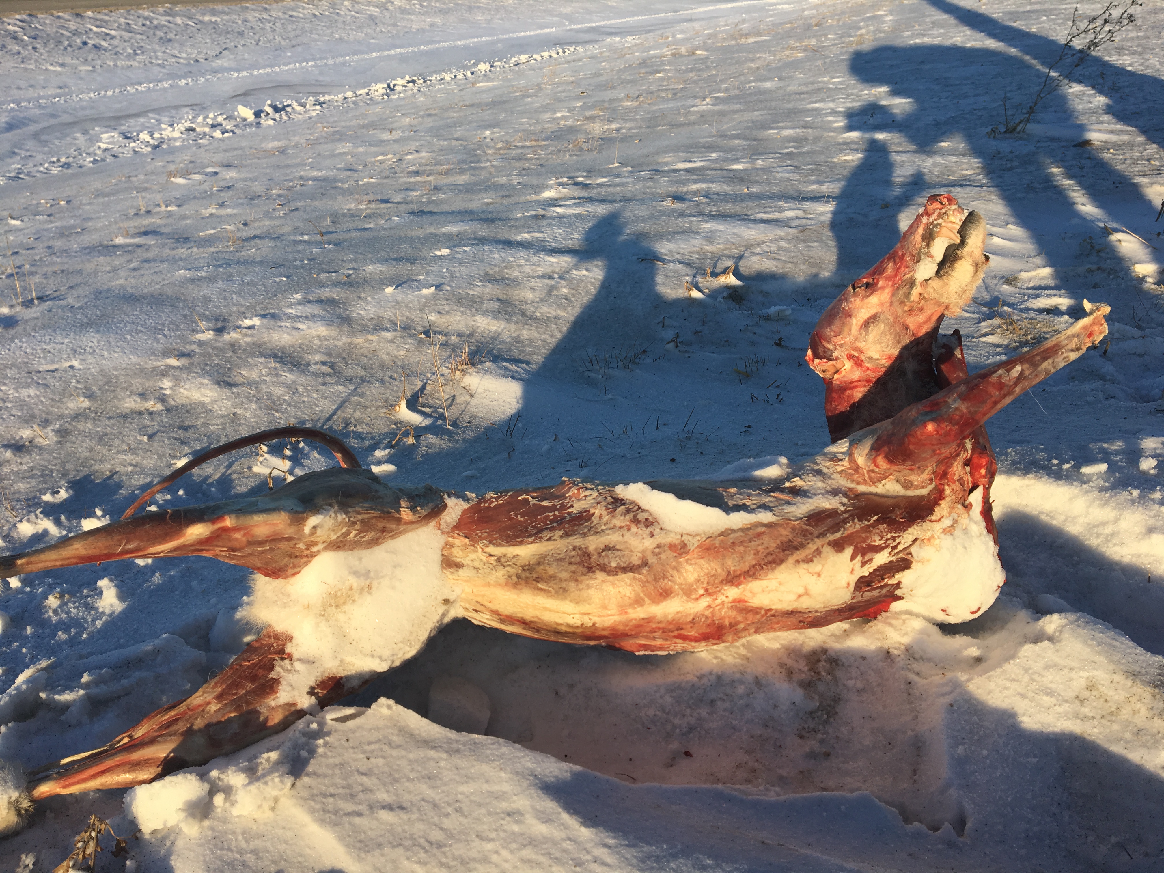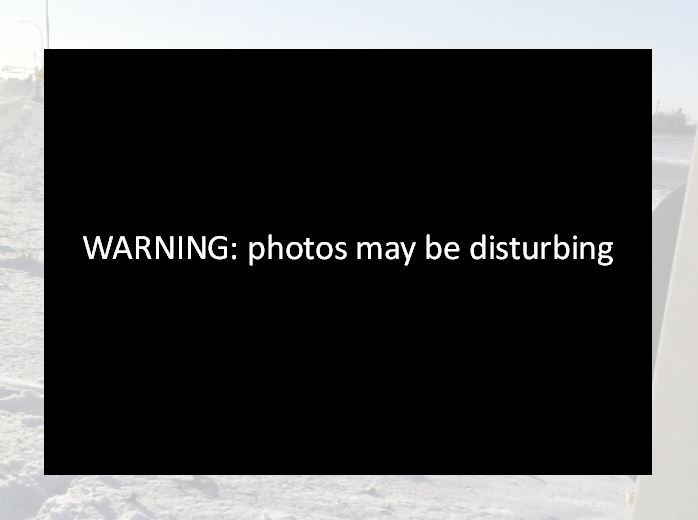 Tkachyk pulled over for a closer look, thinking it might be a deer. What she found was shocking and unnerving. It was an animal carcass that had obviously been skinned.