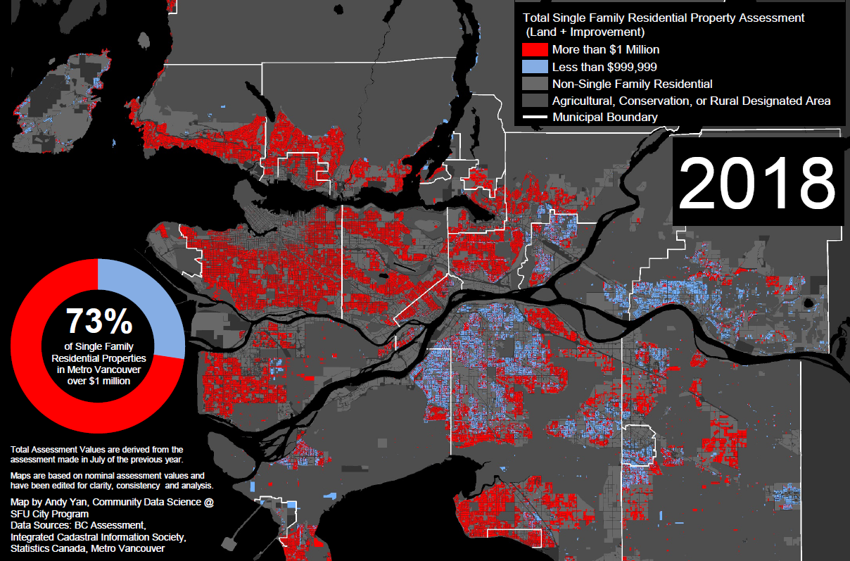 Yan spent as long as two weeks combing through data from the 2018 assessment and found that 73 per cent of single-family homes across Metro Vancouver are worth $1 million or more.