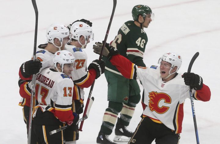 After Smith stopped Ryan Suter on a breakaway, Gaudreau outraced Jason Zucker to the puck going the other way. Gaudreau waited and fed Hamilton for a one-timer.