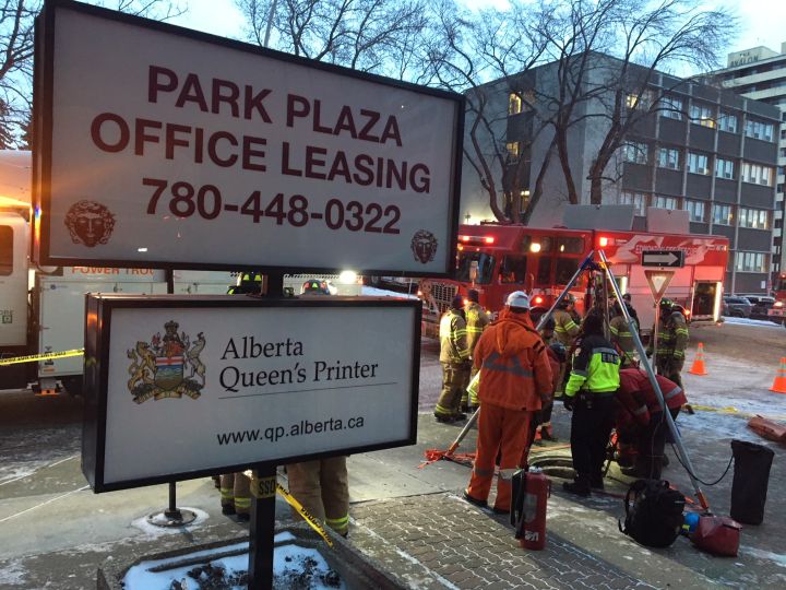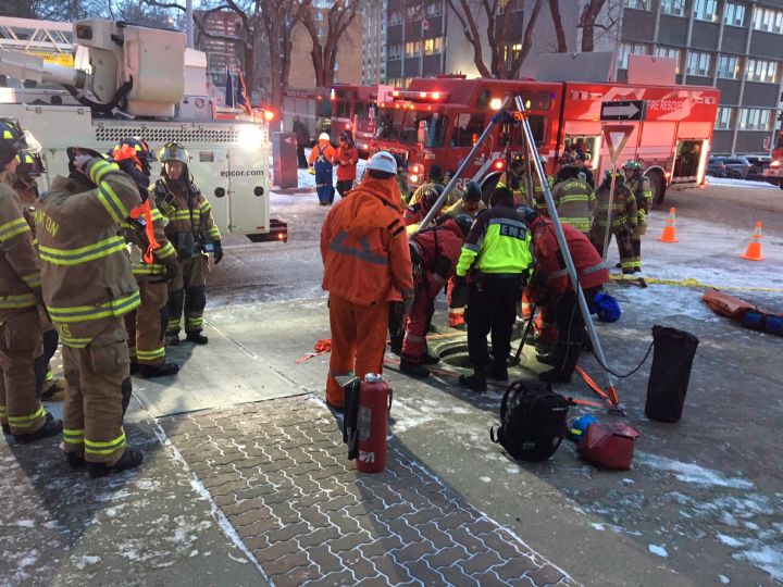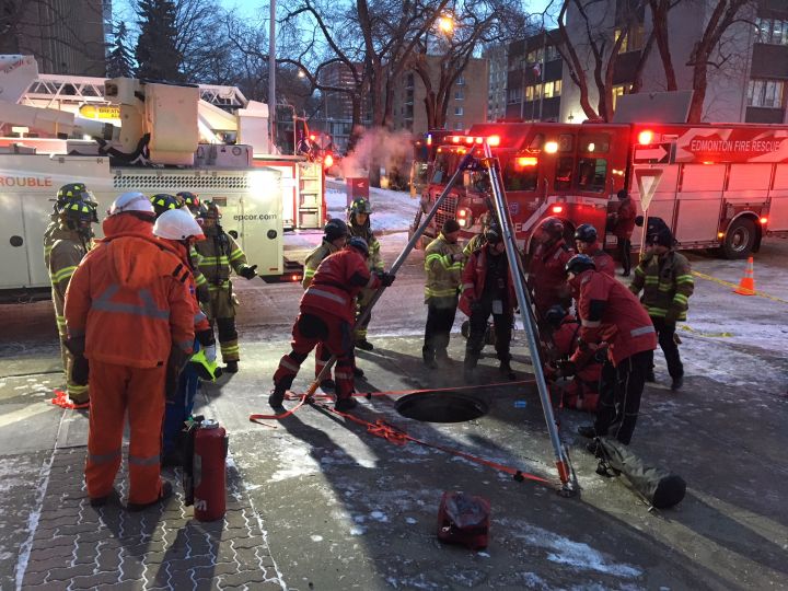 “We have reports that there’s an injured civilian on scene who actually fell down into one of the manholes,” Edmonton fire rescue services spokesperson Maya Filipovic said early Wednesday morning.