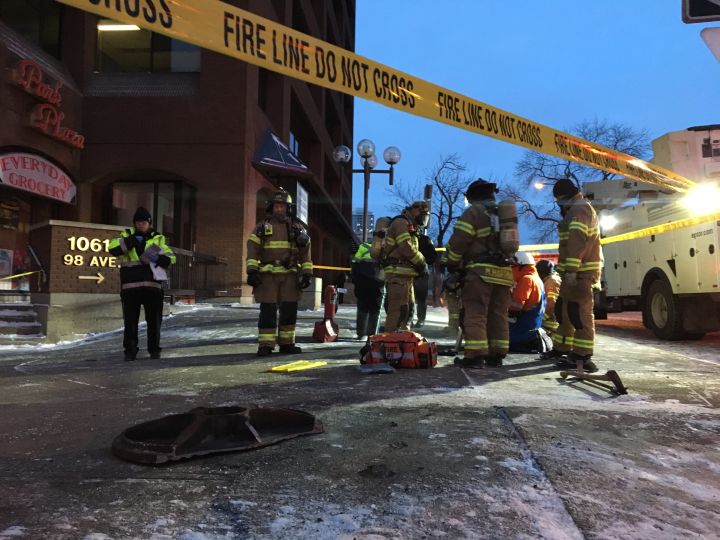 Watch below: Emergency crews were called to Edmonton’s downtown core Wednesday morning after an underground electrical vault explosion. Fire officials said a woman fell down a maintenance hole after the explosion forced several covers to pop off. Vinesh Pratap reports.