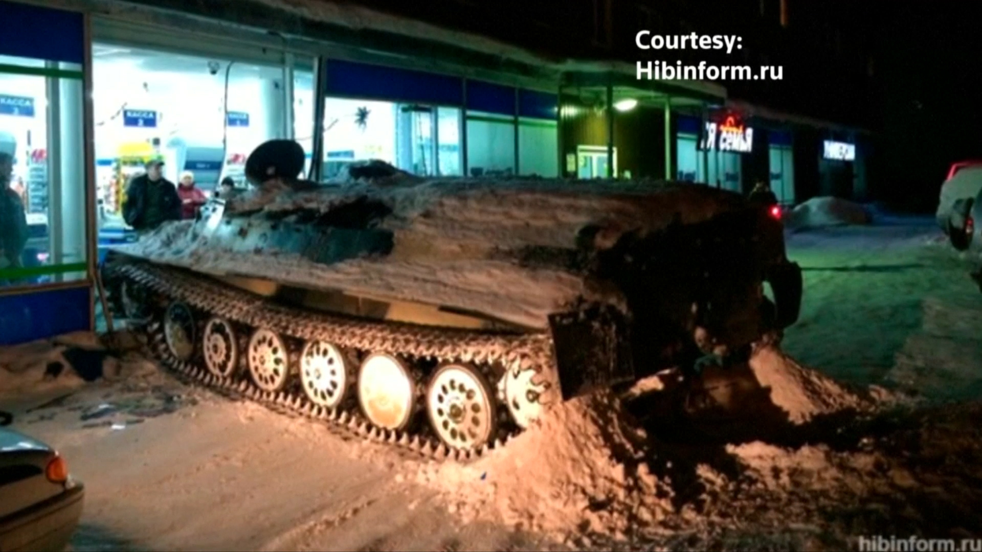 The joyrider drove the armoured vehicle through his small town of Apatity where he badly damaged a parked car and then careered through the front of the supermarket.