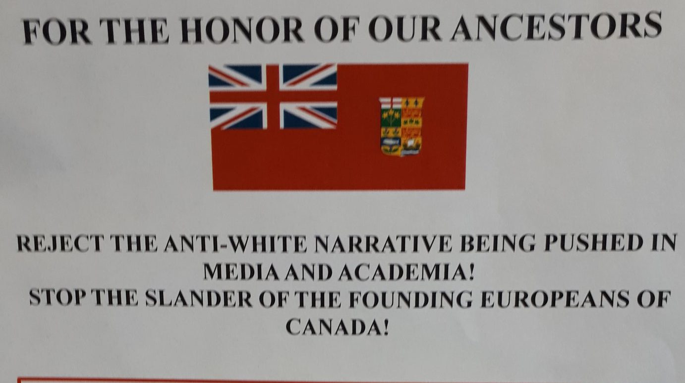 The posters make inflammatory statements about the former residential school system in Canada and call on readers to reject what it calls an anti-white narrative being pushed in media and academia.