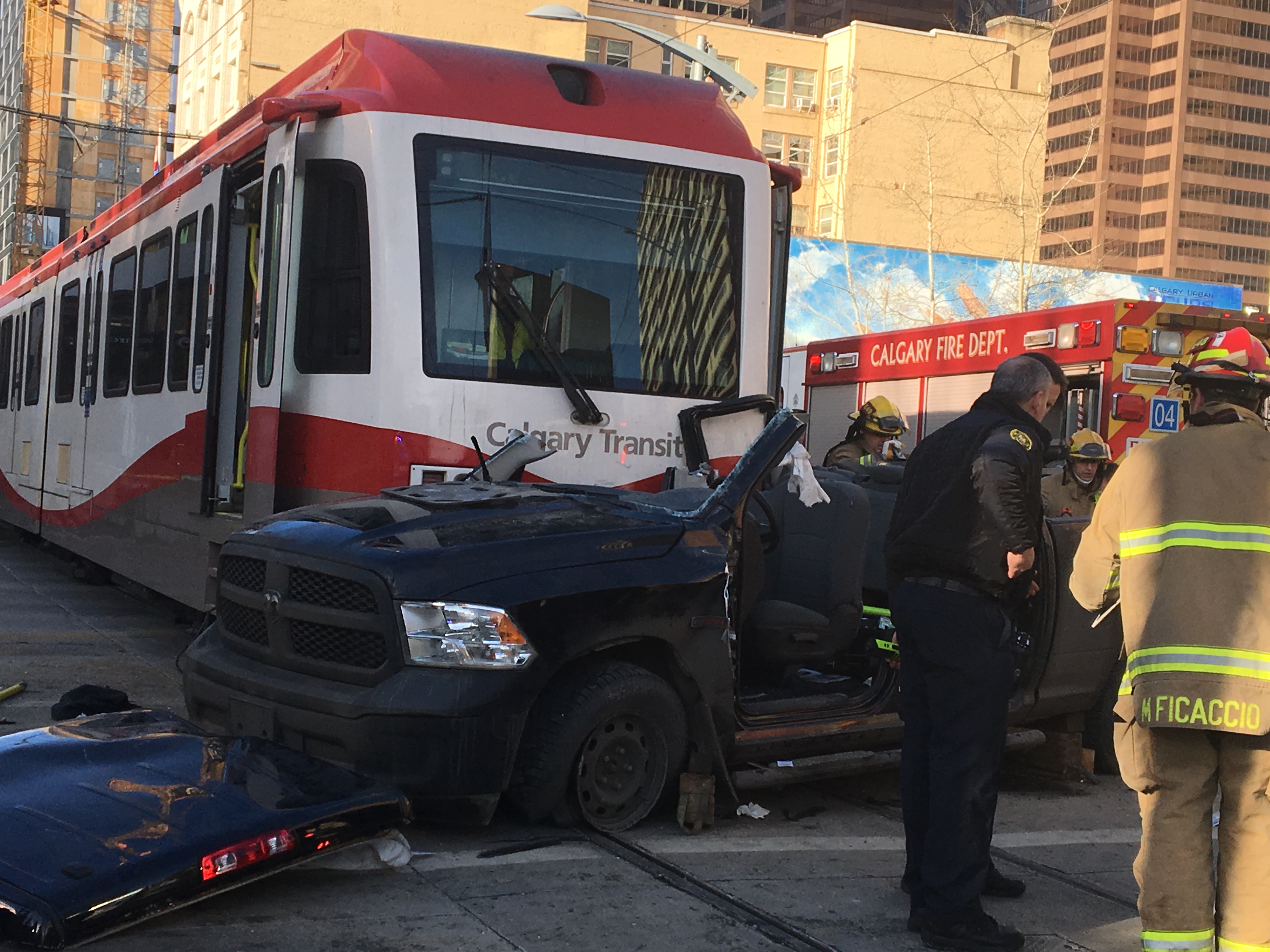 It happened at around 10:30 a.m. on 7 Avenue near 1 Street SE, when a truck collided with a C-Train.