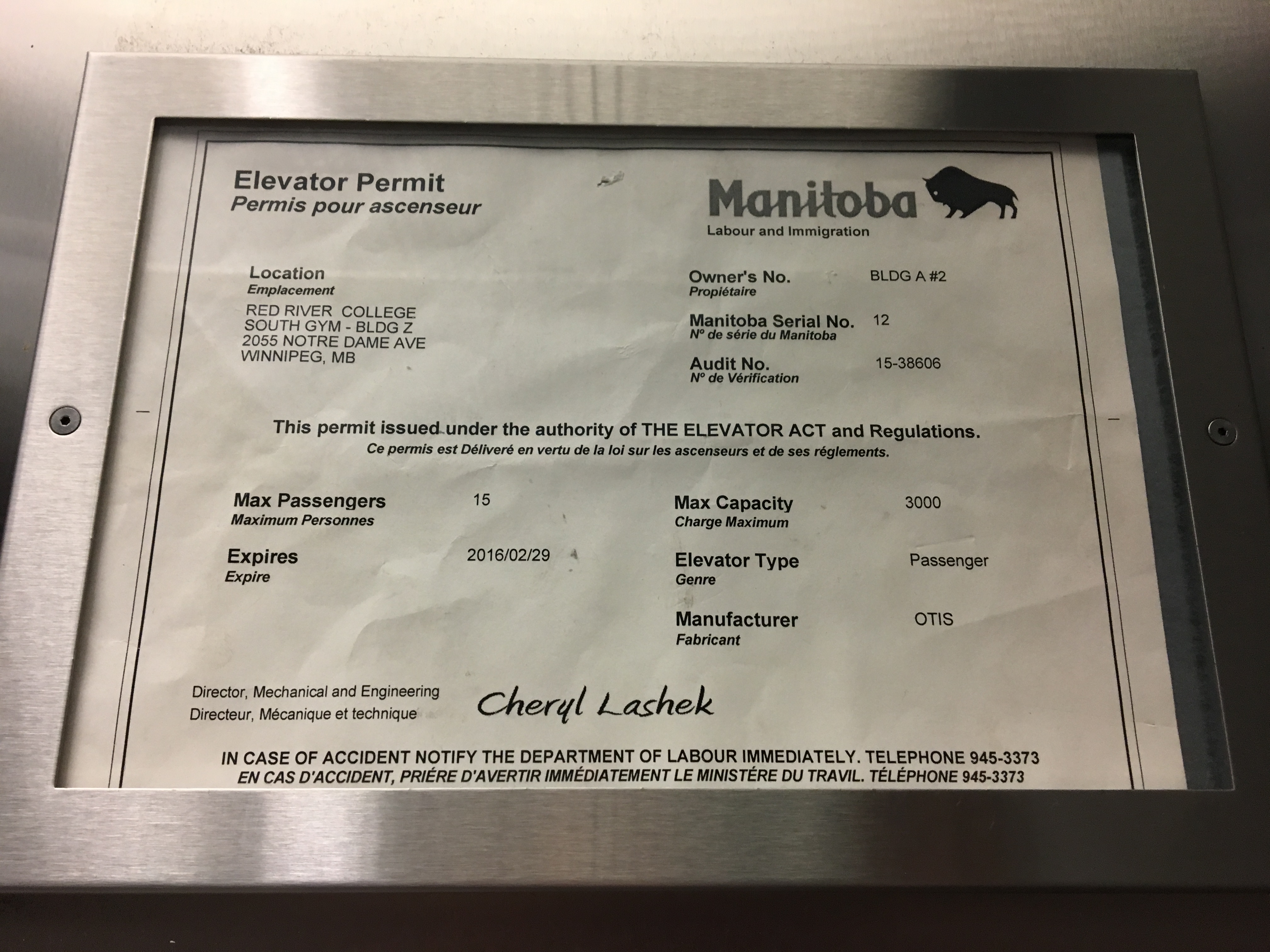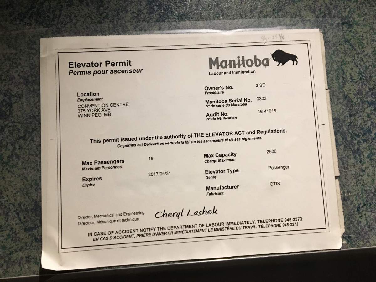 The permit in one of the elevators at the RRC Notre Dame Campus expired nearly two years ago, in February 2016, while the permit at the convention centre expired in May, 2017. The one on display at an elevator in Portage Place expired at the end of October.