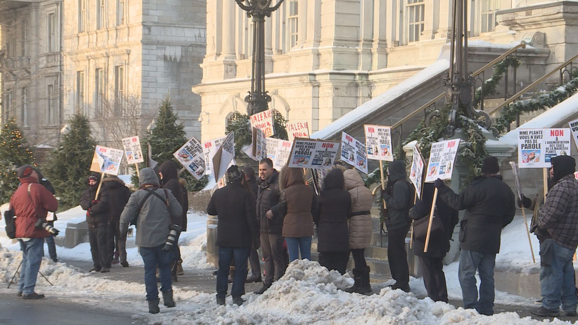 As Montreal city council prepared to vote on the Plante administration’s controversial budget, a few dozen protesters braved the cold outside city hall to show their opposition to it.