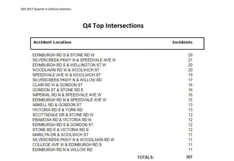 Guelph police also released the top intersections in the city for collisions with Edinburgh and Stone road seeing the most at 29. Silvercreek Parkway and Speedvale Avenue saw 21.