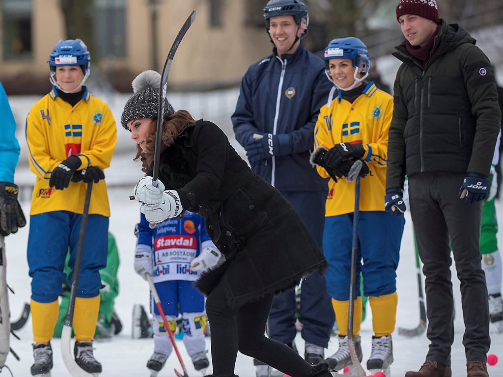 On Tuesday, during their four-day tour of Sweden and Norway, the pair took part in a bandy shootout in Stockholm; the sport looks a lot like hockey, but differs in a few ways — there’s a ball instead of a puck, the sticks have a bend and the goal is larger.