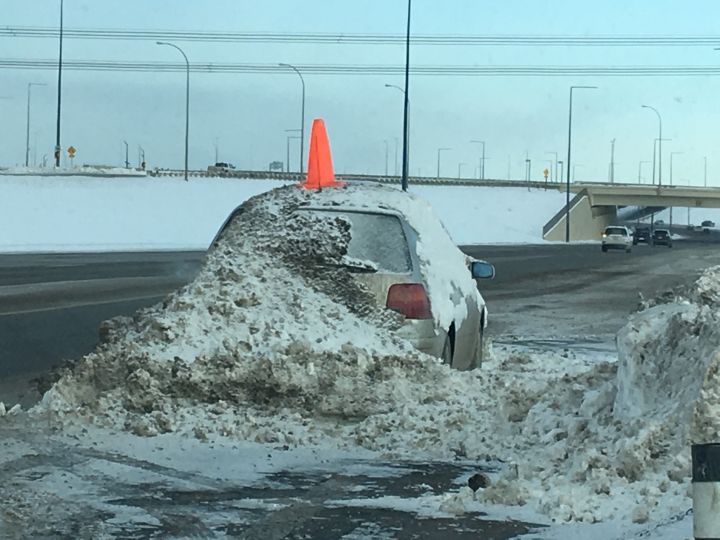Blaine told Global News Parking Enforcement was working with the city Roadways department to clear the snow around the car so a tow truck could access it.