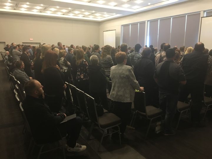 There were about 400 chairs inside Room 106 of the Edmonton Expo Centre on Wednesday. Nearly all of them had farmers or those who work with farmers sitting in them. Those who came late and didn’t want to wade through the rows to the empty middle seats stayed at the back of the room. They leaned against the wall or sat on the floor.