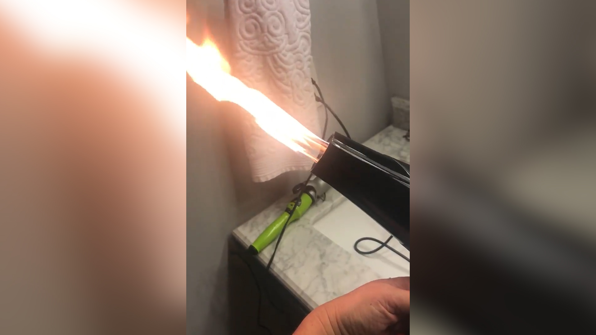 “Oh my gosh. I can not freakin’ believe this,” Erika Augthun Shoolbred said in the video she posted to her Facebook page on Jan. 29. “Fire is coming out of the hair dryer.”