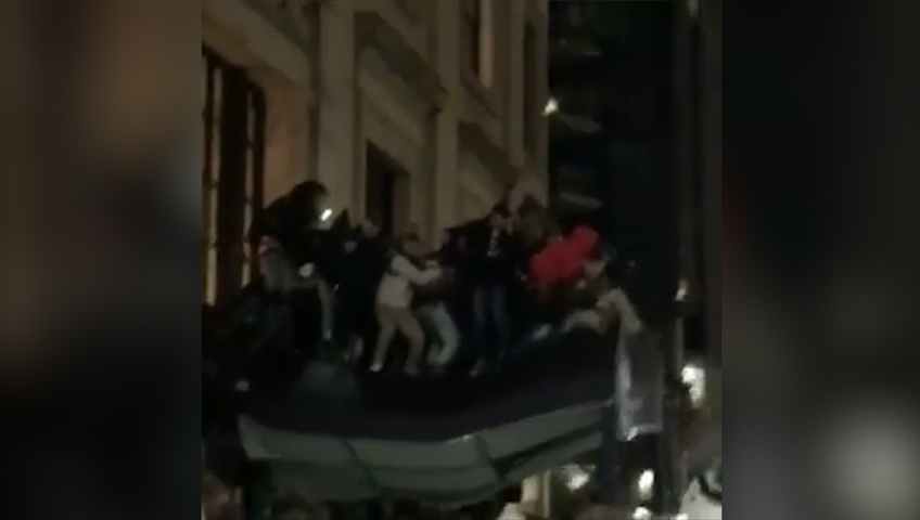 Unfortunately, an awning outside the Ritz Carlton hotel couldn’t carry the weight of partying Eagles fans.