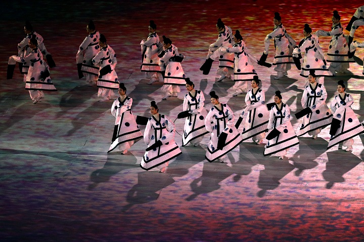 A unified Korean team of athletes marched out together carrying the unification flag as South Korean President Moon Jae In watched from the stands near Kim Yo Jong, the sister of the North Korean leader.