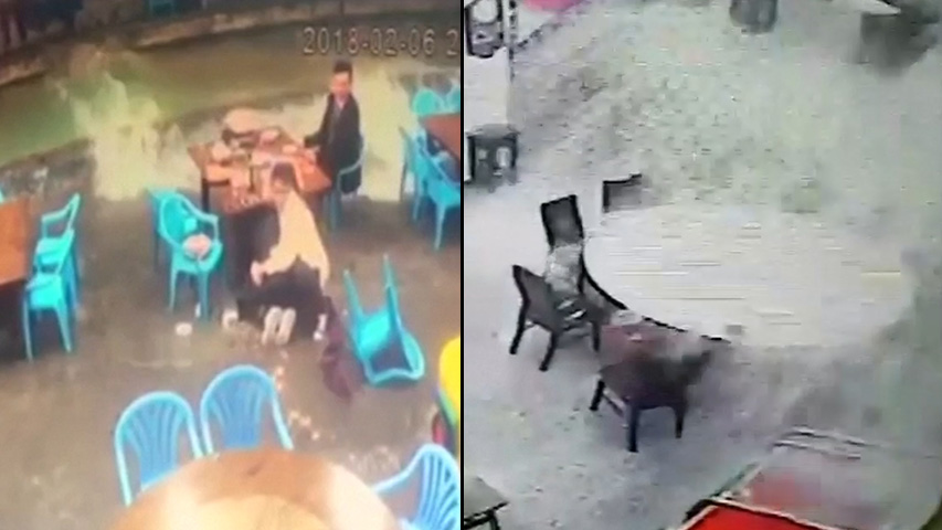 Footage showed two “live prawn fishing” restaurants with indoor ponds reacting to the tremor with massive waves crashing onto furniture before flooding the restaurants.