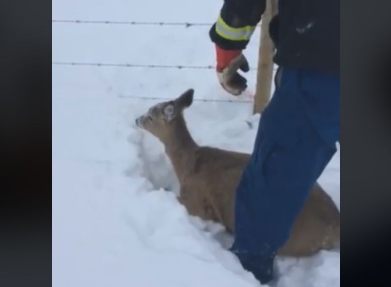 Marshall Stasiuk posted video of the whole exchange on Facebook. It shows Stasiuk and his co-worker, Corey Dennett, approaching the deer who is laying in deep snow with one of its back legs caught in fencing. One of them holds the deer while the other works to free the leg.