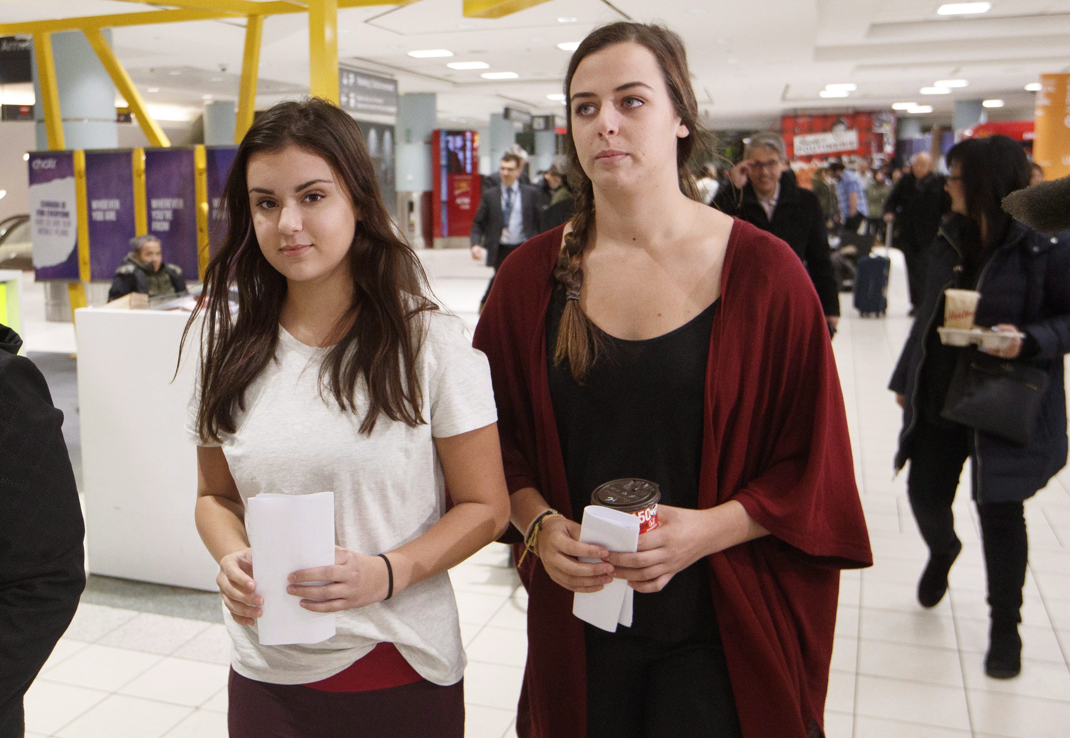 Eden Kazoleas, 19, of Drayton Valley, Alta., and 26-year-old Jessica Drolet briefly spoke to reporters at Toronto’s Pearson airport where they denied the charges against them.