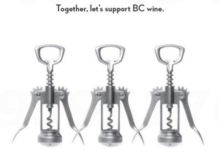 The government has taken out a full page ad with interlocking corkscrews and the slogan, “Together, let’s support B.C. wine.”