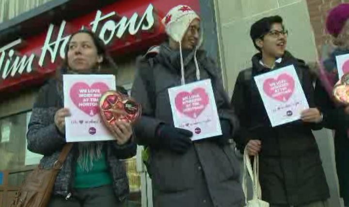 Tim Hortons employees at over 200 locations across Ontario received special Valentine’s Day cards and chocolates from workers’ rights advocates on Tuesday in a show of support for improved working conditions.
