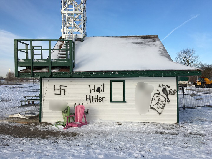 Swastikas and the words ‘Hail Hitler’ were painted on the side of the small building. Human genitalia was also among the graffiti.