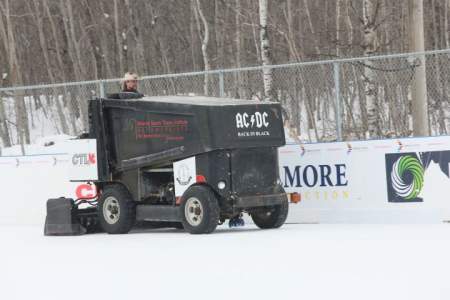 The team of volunteers that works on the ice operates two to three zambonis 24 hours a day. Each zamboni holds about 945 litres of water, and each time the volunteers flood the ice they typically put down two zambonis’ worth of water.