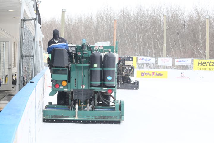 “It’s not good particularly for the ice because all we can do is dry scrape,” Mike Mesi said of the weather. Mesi is one of the zamboni crew members working around the clock to keep the ice in tip-top shape out at Saiker’s Acres.